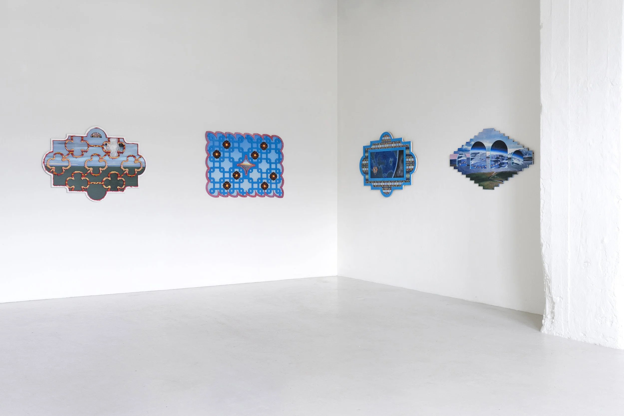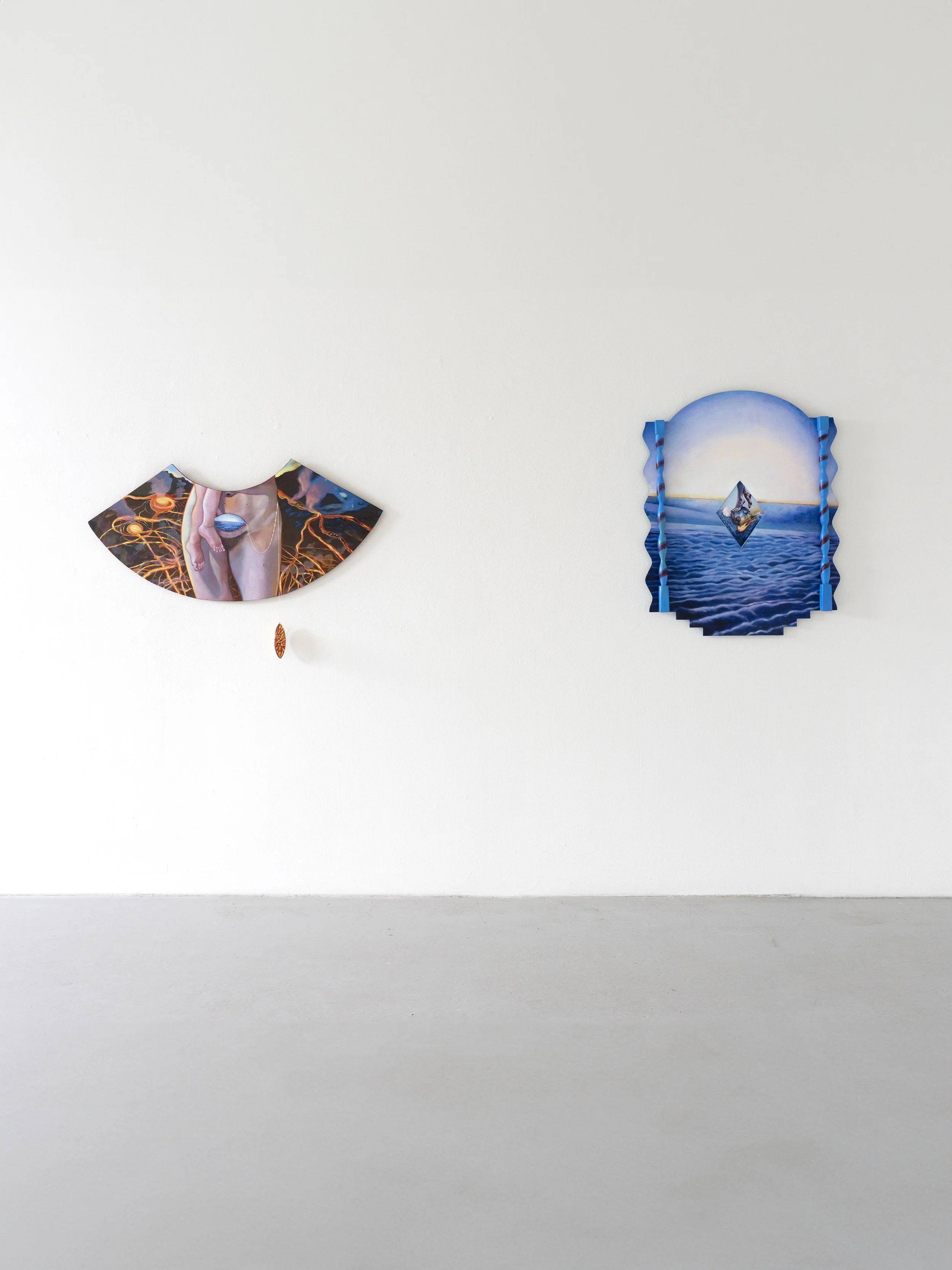 Skurðir, Oil painting on custom wooden panels, embroidery thread, metal. Installation shot from “The Navel of the World” Icelandic Printmakers Association, June 2025. © Sara Sig